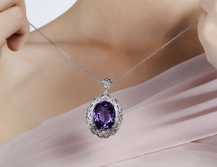 19.89 carat Natural Amethyst. 0.97 carat Diamond. 18K Gold Necklace. Luxury packaging included. We can make a free customized 3D drawing based on this design and your wishes. Please contact us below. Also if you require advice from our experts.
