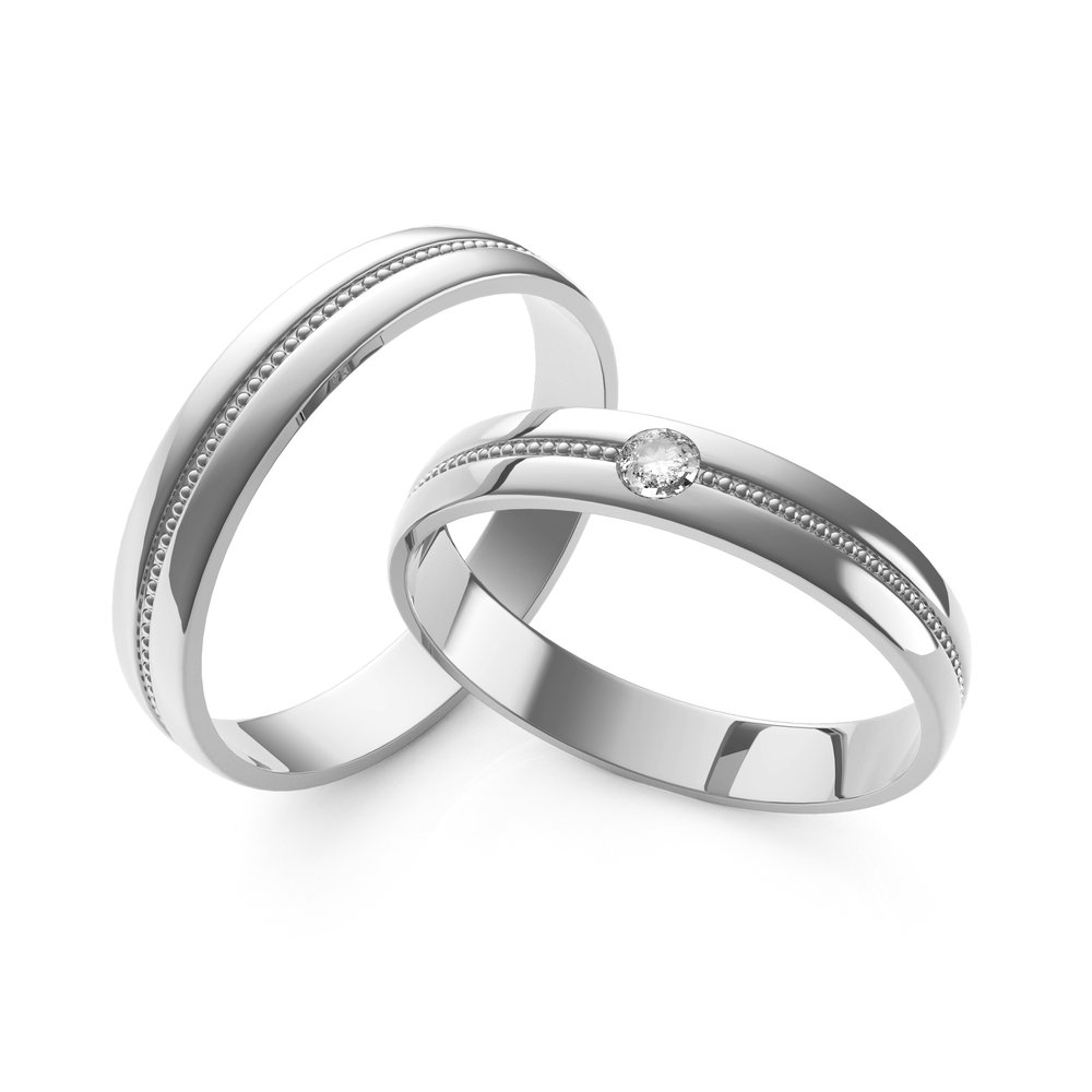 This is a configurable ring set. Both the width and the profile can be chosen. The set shown has the following specifications: 18K white gold. Mens ring width 5mm. Womens ring width 3.5mm. Height 2 mm. 0.07 carat diamond total weight. G color. VS clarity. Excellent cut. Luxurious packaging included. We can make a free customized 3D drawing based on this design, the ring sizes and your wishes. Please contact us below. Also if you require advice from our experts.